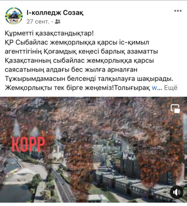 ҚР Сыбайлас жемқорлыққа қарсы іс-қимыл агенттігінің Түркістан облысы бойынша департаментінің тапсырмасымен жастардың арасында сыбайлас жемқорлыққа қарсы мәдениетті қалыптастыру, патриотизм, елін жерін сүйетін, саналы да адал азамат тәрбиелеу мақсатында «АДАЛДЫҚТЫҢ БАСТАУЫ- САНАЛЫ ҰРПАҚ» тақырыбында 15 сәуір "№1 колледж" МКҚК -ның студент жастармен кездесу өткізіліп, бейнеролик көрсетілді.