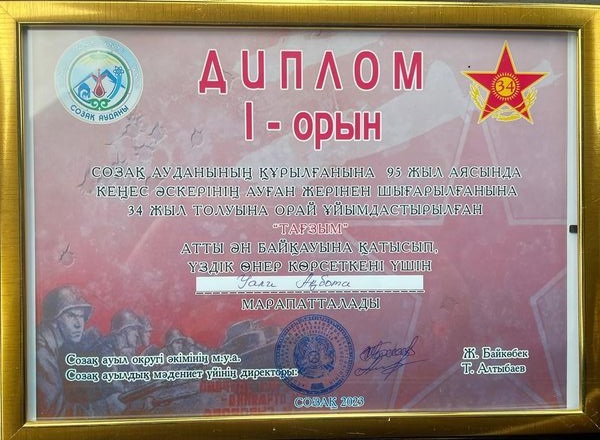 Созақ ауылдық мәдениет үйінде 13.02.2023 жылы Созақ ауданының 95 жылдығына орай және Кеңес әскерлерінің Ауғанстан жерінен шығарылғанына 34жыл толуына арналған «Тағзым» атты әскери-патриоттық ән байқауына «№1 колледж» МКҚК-ның өндірістік оқыту шебері Уали Ақбота қатысып жүлделі 1-орынды иеленді. Колледждің көркемөнерпаздар үйірмесінің сүйемелдеуімен 2 шартты орындап,әділқазылар алқасының назарына ілінді.