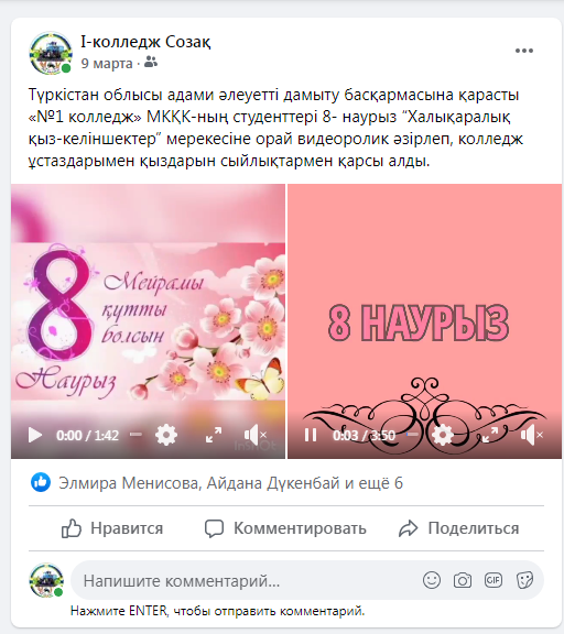 Түркістан облысы адами әлеуетті дамыту басқармасына қарасты «№1 колледж» МКҚК-ның студенттері 8- наурыз “Халықаралық қыз-келіншектер” мерекесіне орай видеоролик әзірлеп, колледж ұстаздарымен қыздарын сыйлықтармен қарсы алды.