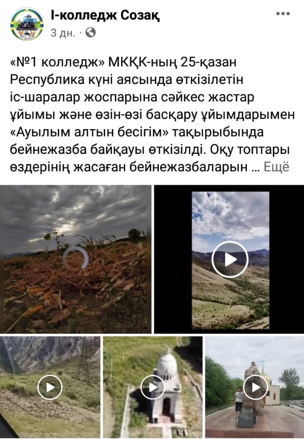 Қазақстан Республикасының Президенті Қасым-Жомарт Кемелұлы Тоқаевтың «Әділетті мемлекет Біртұтас ұлт «Берекелі қоғам» атты Жолдауы халық апараттық-түсіндіру жоспарына сәйкес 2022жылдың 6-қазан күні «№1 колледж» МКҚК ның бір топ студенттері және жастар ұйымы колледж педагог-психологы Ш. Жақсыбаева Созақ ауылының киелі орындарына экскурсия жасады. Экскурсия барысында студенттер тарихи орындарына тарихи ескерткіштерімен танысып өздеріне керекті көптеген мәліметтерге ие болды.